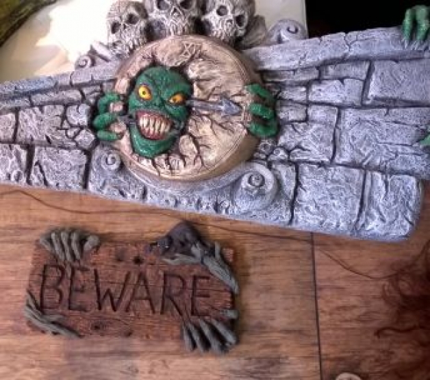 Choose From: * Hanging Post with Creatures Peeping (4) * Hanging Small Stone Wall with Gargoyle and Monsters * Hanging Beware Sign * Treasure Chest, Styrofoam (2) * Gauze Sign, "Beware Enter if you Dare" Banner * Child Ripped Apart Body * Man Hole Props (3) * Gravestone Marker Cross * Black Bird Cages * Jute Roll (2) * Chains (17) - Rent 3/$10 * Skeletons in Shackles (2) * Assorted Bats (13) - 3/$10